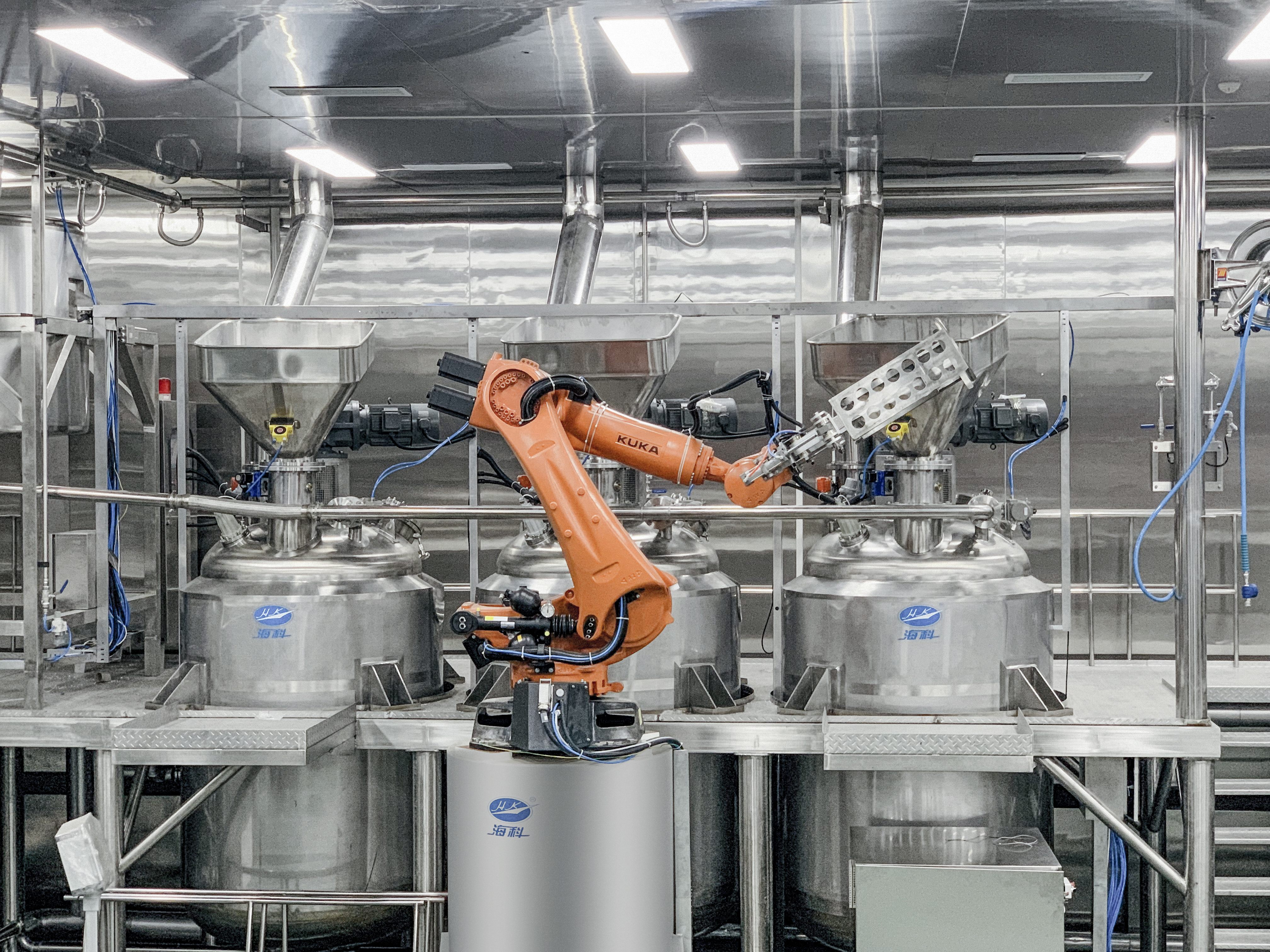 2019年建成的眉山智慧工廠火鍋底料車間,大膽采用反應(yīng)釜機(jī)器人炒料,減少人工對(duì)產(chǎn)品在生產(chǎn)過程中口味及品質(zhì)的影響,同時(shí)也減少異物引入風(fēng)險(xiǎn)。